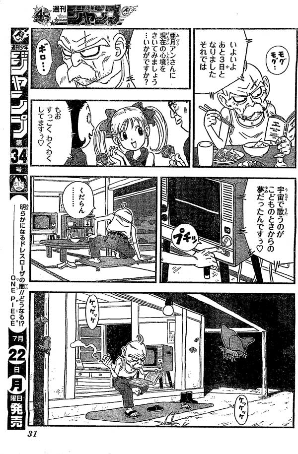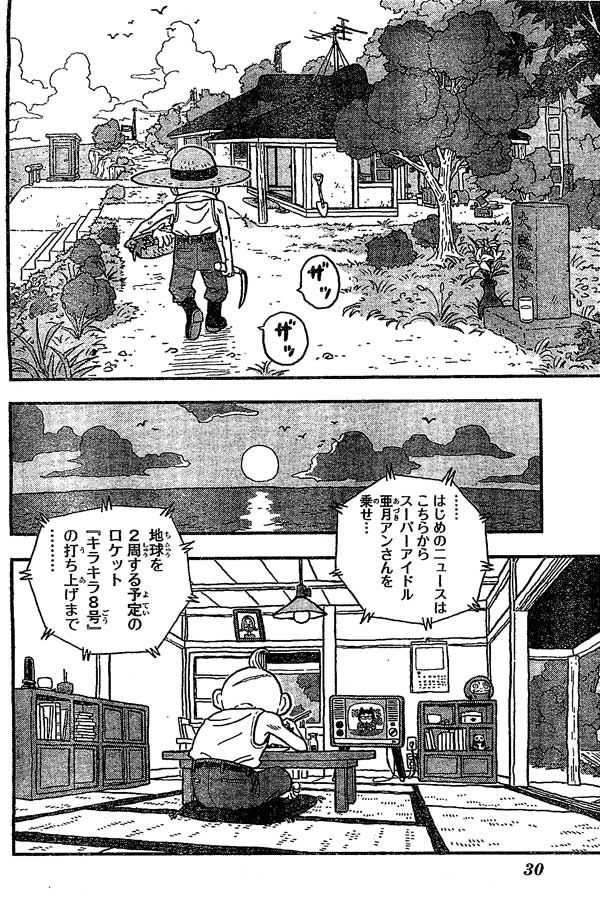 และข่าวบอกตอนนี้เหลืออีก 3 วันก่อนเดินทางก็เลยสัมภาษณ์อาซุกิว่ารู้สึกยังไงบ้าง อาซุกิก็บอกตื่นเต้น ถึงตัวเธอจะเป็นผู้หญิงตัวเล็กๆแต่ความฝันของเธอก็คือการได้ไปร้องเพลงบนอวกาศ ถึงตรงนี้ตาแก่ก็ปิดทีวีและบ่นว่า "ขำตายล่ะ" จากนั้นก็มานั่งที่ระเบียงบ้านอ่านหนังสือ