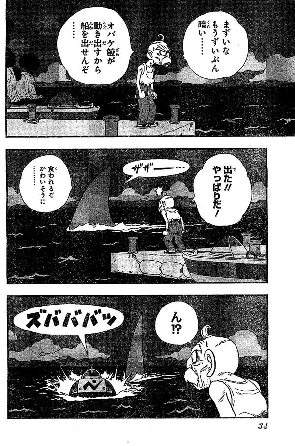 แต่เพราะมืดไปหมดและเพราะมีสัตว์ประหลาดฉลามอยู่บริเวณนี้ด้วยก็เลยออกเรือไปดูไม่ได้และคิดอย่างเลวร้ายก็คิดว่าอาจจะโดนฉลามกินไปแล้ว แต่ทันทีนั้นเองฉลามก็โผล่มาแต่ก็มีสิ่งหนึ่งเหมือนจะหนีฉลามมาอยู่