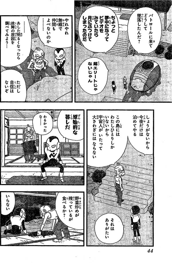ทำไมถึงมาตกที่ดาวนี้ แพโทรลแมนบอกเขาดูวีดีโอเพลินไปหน่อยจนบินไปชนดวงจันทร์เข้า ตาแก่ถามอย่างพอเข้าใจว่าแพโทรลแมนก็ติดต่อคนอื่นมาช่วยไม่ได้ ส่วนเรื่องยานคงต้องรอให้สว่างก่อนแล้วจะดูให้อีกทีแต่ก็ไม่รับประกันว่าจะซ่อมได้ ตาแก่เลยไม่มีทางเลือกที่จะให้แพโทรลแมนค้างไปก่อน นอกจากนั้นตาแก่บอกเขาอยู่คนเดียวบนเกาะนี้เพราะงั้นถึงมนุษย์ต่างดาวจะค้างคืนก็ไม่เป็นเรื่องใหญ่ แพโทรลแมนเห็นบ้านแล้วก็บอกเรียบสุดๆตาแก่เลยบอกขอโทษด้วยแต่ไม่เข้าใจมาตรฐานบ้านของต่างดาวแล้วก็เอาเบาะรองมาให้และถามอยากได้อะไรอื่นอีกมั้ย