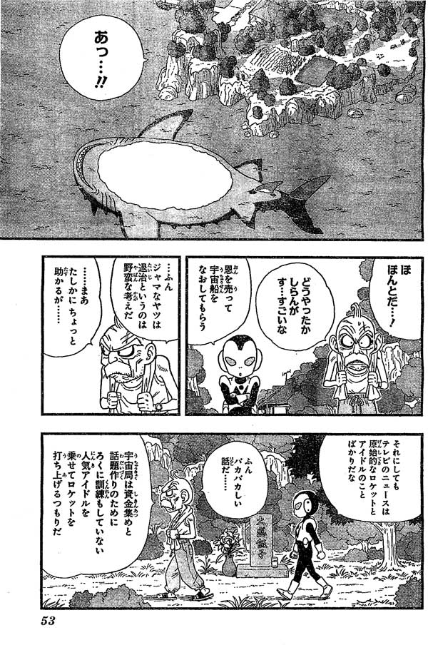 โอโอโมริก็ถึงกับตะลึงที่เห็นเจ้าฉลามนั้นนอนหงายท้องขึ้นอืดไปแล้ว ถึงกับพูดเลยว่าจริงงั้นเหรอถึงจะไม่รู้ว่าทำได้ไงแต่ก็สุดยอด จาโกะบอกถือเป็นการตอบแทนที่จะช่วยซ่อมยานให้เขา โอโอโมริบอกถึงจะดูป่าเถื่อนแต่ก็ถือว่าทำให้เขาสะดวกขึ้นจริง แล้วจาโกะก็พูดถึงเรื่องที่ข่าวออกว่าเรื่องที่ไอดอลจะขึ้นจรวด โอโอโมริบอกนั้นก็คือขำๆไร้สาระ ก็แค่พวกหน่วยงานอวกาศใช้ไอดอลที่ไม่ได้ฝึกมาทำให้สนใจและระดมทุน