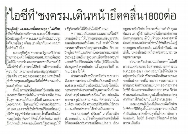 14 กรกฎาคม 2556 กันยายน2556 นี้รู้ผล!!(ช่วงก่อนหมดสป.) ICT นำเรื่องยึดคลื่น 1800 900 470 2300 ให้ครม.เห็นชอบในการปรับปรุงใช้ต่ออีก 13ปี ++ กสทช.ต้องหยุดการประมูล++(ตามแผนแม่บทที่ กสทช. ทำขึ้นสูตร 5-10-15)
