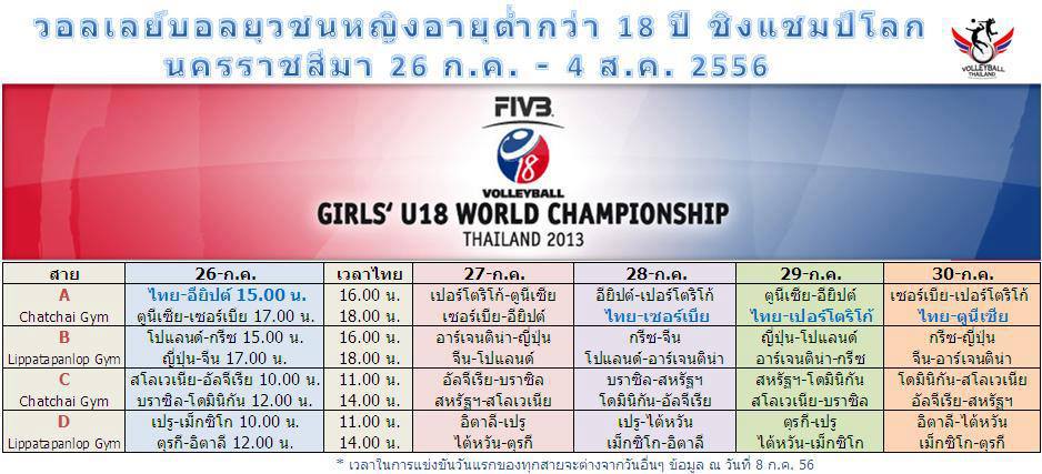 โปรแกรมออกมาแล้ว(ตามรูป) ถ้าใครไปเข้าชมในสนามราคาบัตรเข้าชมเกมการแข่งขันวอลเลย์บอลยุวชนหญิงชิงแชมป์โลก ที่จะแข่งขัน จ.นครราชสีมา วันที่ 26 ก.ค.- 4 ส.ค.56 ได้มีการกำหนดออกมา 3 ราคา ประชาชนทั่วไป 100 บาท นักเรียน-นักศึกษา 50 บาท บัตรที่จำหน่ายตามโรงเรียน 30 บาท และบัตรวีไอพี (ชมตลอดรายการ) 900 บาท