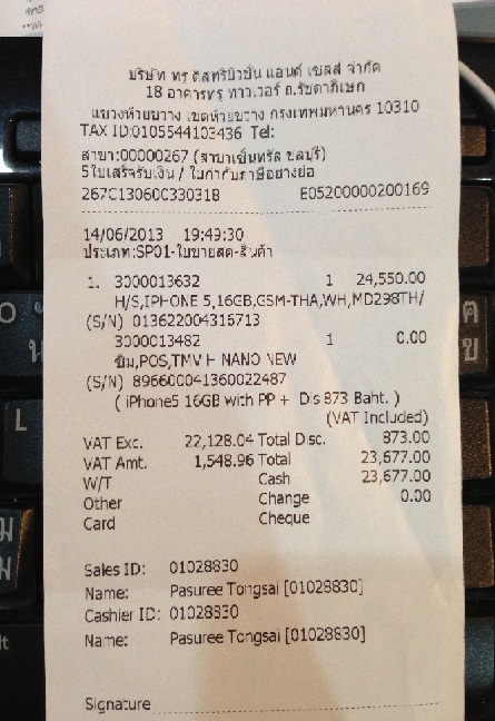 เริ่มต้นจากวันที่ 14/06/2556 ผมได้ไปซื้อ iPhone5 ที่ True shop สาขาเซนทรัลชลบุรี โดยเป็นการซื้อเครื่องพร้อมโปรโมชั่นดังไฟล์รูปใบเสร็จที่แนบมานะครับ