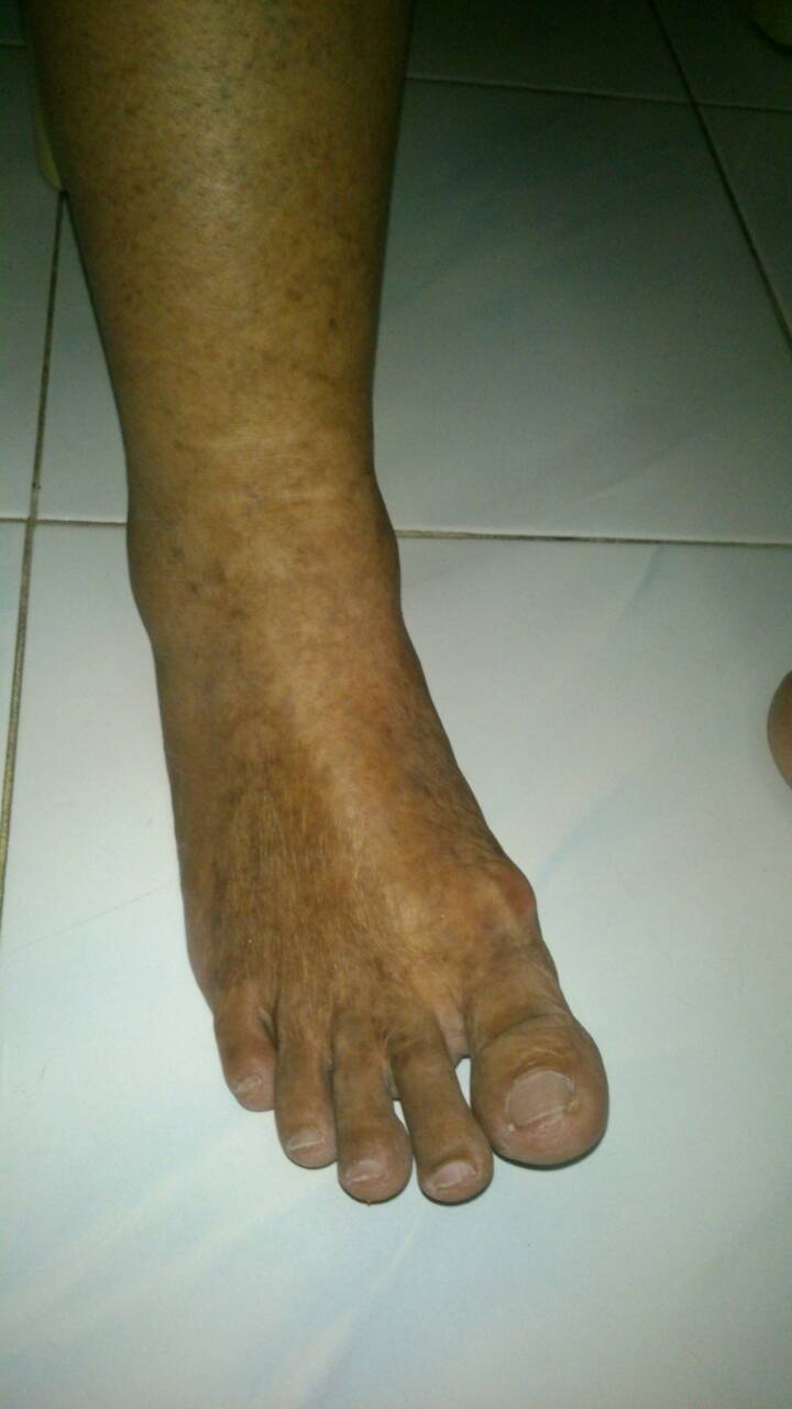 เท้าเขียวคล้ำ แต่ไม่เจ็บปวดอะไร เกิดจากอะไรคับ ตามรูปเป็นเท้าของคุณแม่ มีโรคความดัน กับเบาหวาน เป็นมานานแล้ว กินยาตามหมอสั่งตลอด ถามคุณหมอก็ว่าไม่เป็นไร ขอคำแนะนำด้วยครับ