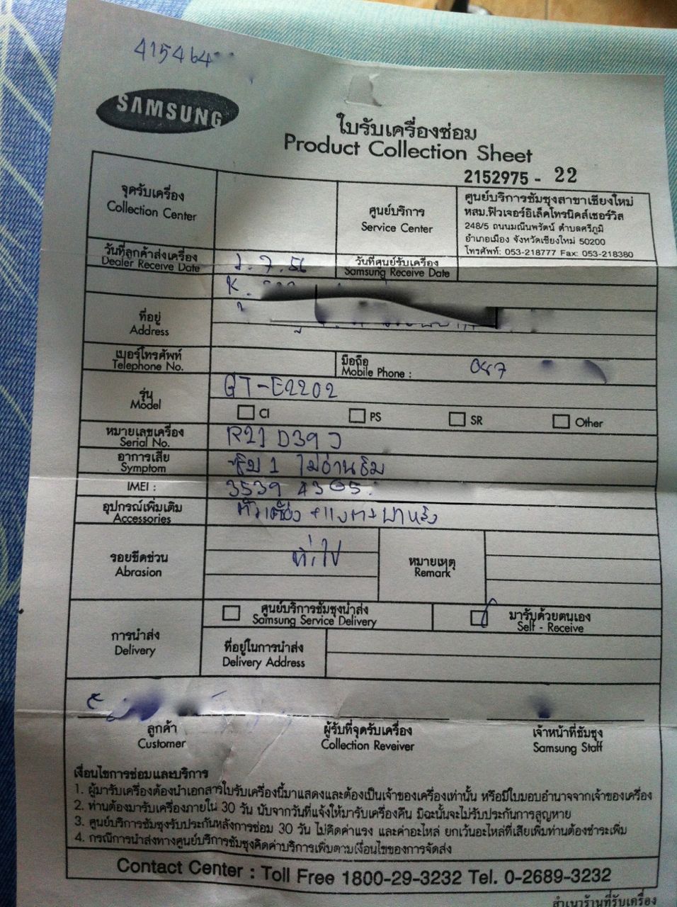 เพิ่มเติมรูปใบรับซ่อมครับ ขออนุญาต เบลอข้อมูลบางส่วนเพื่อความเป็นส่วนตัวของทั้งผมและทางเจ้าหน้าที่ Samsung ครับ