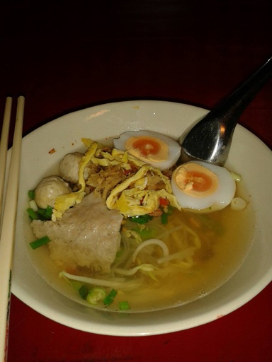 เป็นบะหมี่ต้มยำไข่ ใส่ไข่เจียว เครื่องที่ใส่มาก็จะมีไข่ต้ม ลูกชิ้น หมูสับ แล้วก็ไข่เจียวหั่นฝอย ปรุงรสต้มยำมาเสร็จ ใส่กุ้งแห้งเหมือนอย่างที่ใส่ในส้มตำด้วยค่ะ ชามเนี่ย ราคา 30 บาท
