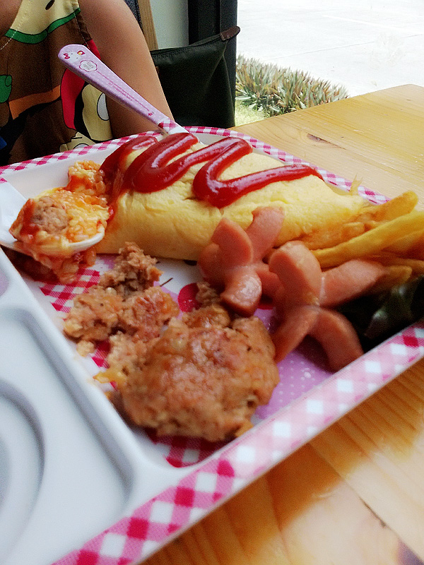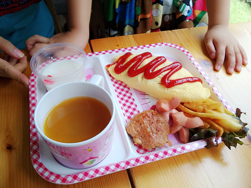 ของเด็กได้ก่อนครับ เป็นชุดคุณหนู มีออมไรซ์ ไส้กรอก แฮมเบิร์ก ฟรายด์ น้ำผลไม้ แล้วก็พุดดิ้งครับ