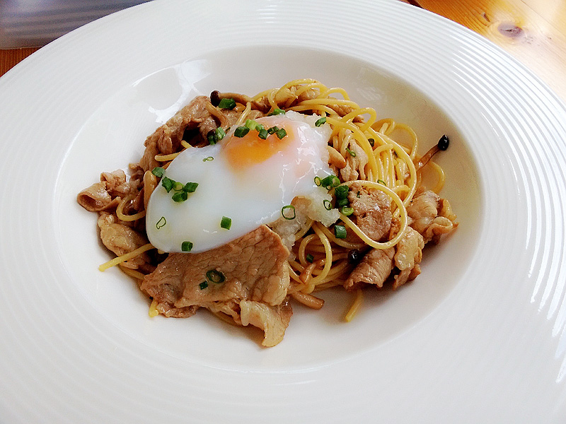 ของผู้ใหญ่มั่งครับ จานแรกเป็นสปาเกตตี้ผัดแบบญี่ปุ่นครับ ใส่เห็ด หมู แล้วก็มีไข่ออนเซ็นโปะหน้ามา