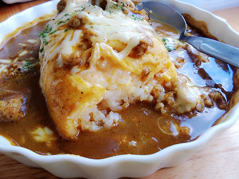 ข้าวญี่ปุ่นเหนียวนุ่มห่อไข่ ราดด้วยแกงกะหรี่แบบญี่ปุ่น รสเข้มข้นมากครับ หอมเครื่องแกง แถมชีสก็เยิ้มเข้ากันสุดๆ