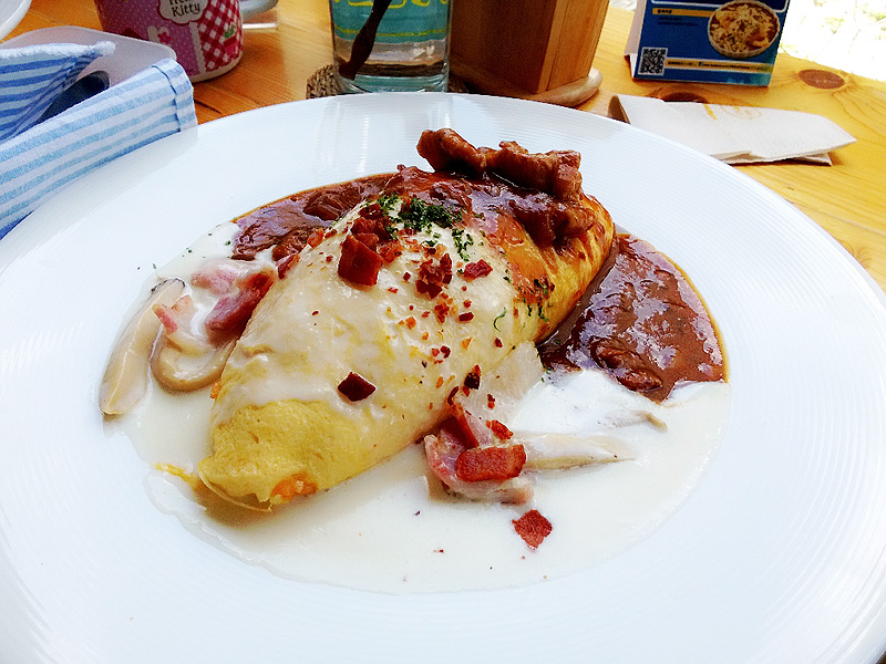 จานนี้สำหรับคนไม่ชอบแกงกะหรี่ครับ เป็นข้าวห่อไข่ราดซอสสองซอส คือเดมิกราส์กับมัชรูมไวท์ซอส