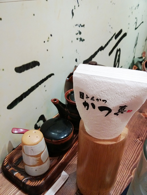 บนโต๊ะก็มีอุปกรณ์ตามสไตล์ร้านหมูทอดญี่ปุ่นทั่วๆไปครับ ซอสต่างๆครบครัน กระดาษทิชชู่พิมพ์ลายสวยงาม