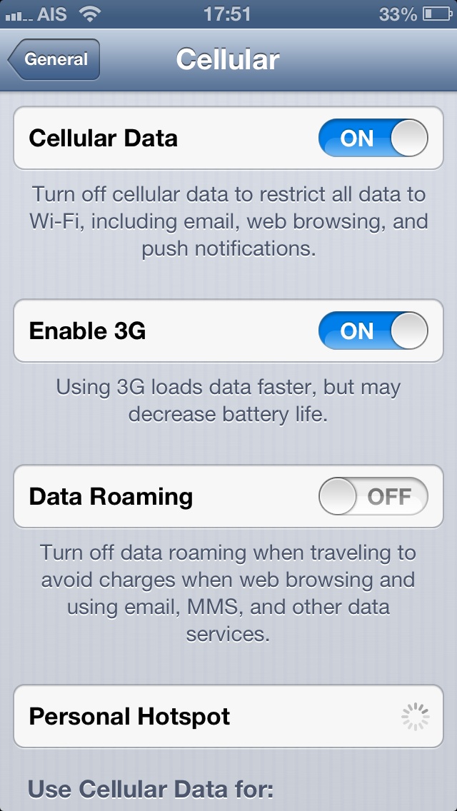 ตามหัวข้อเลยครับ คือว่าจะแชร์เนต เปนเนตของ ais 3g 2100 ใช้ iphone5 อะครับ แต่ฮอตสปอตส่วนบุคคลมันหมุนตลอดเวลาทำให้กดเปิด-ปิดไม่ได้