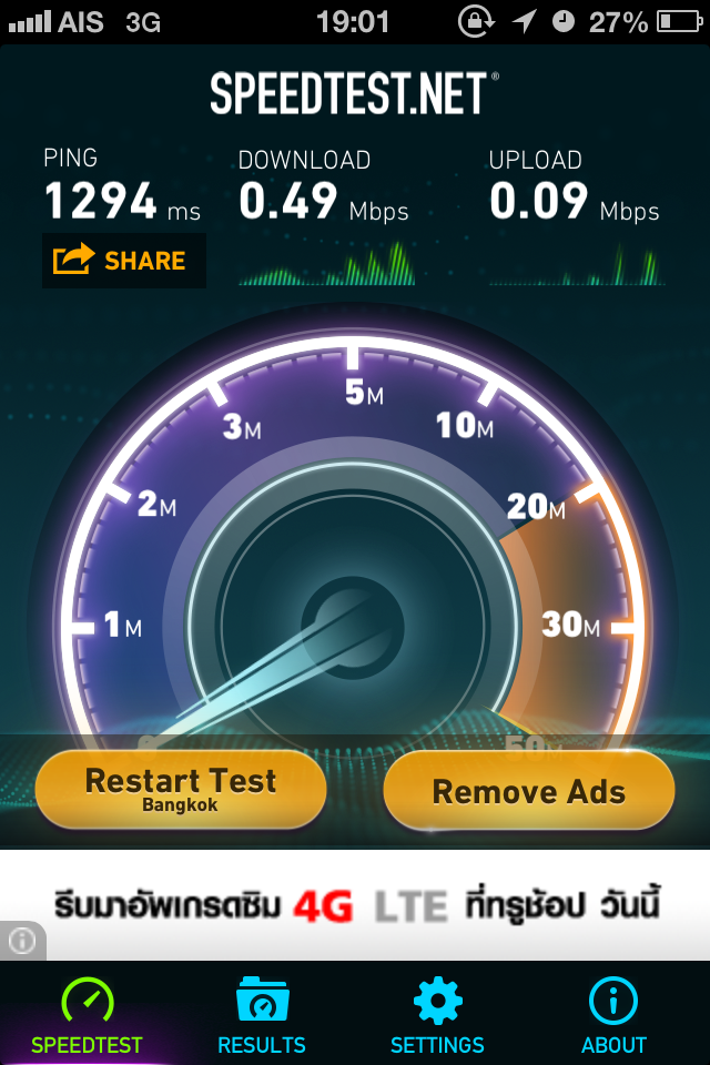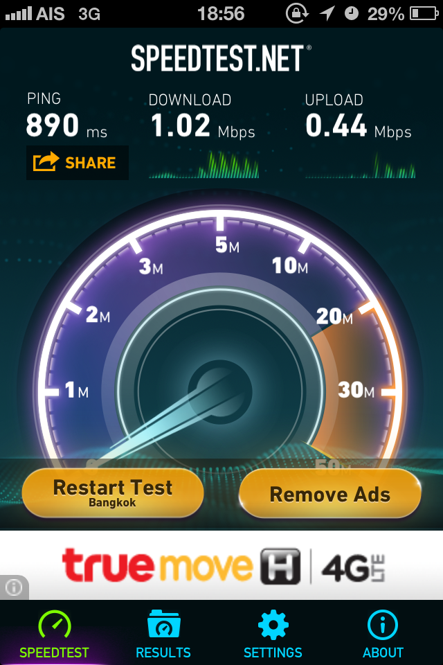 จากที่ทุกท่านรู้ดีอยู่แล้วว่าความเร็วของ 3G ขึ้นอยู่ปัจจัยต่่างๆ มากมาย บลา บลาๆๆๆๆ 1 ในนั้นคือ จำนวนผู้ใช้บริการที่ใช้งานร่วมกับเรา ณ ขณะนั้น วันนี้เลยอยากทดสอบตอนดึกๆ เพราะคิดว่าคนส่วนใหญ่หลับแล้ว