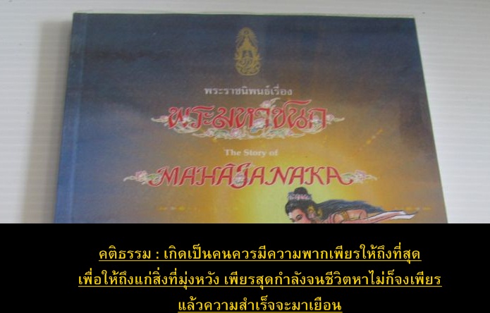 พระมหาชนกตรัสตอบว่า "แม้จะรู้ว่าสิ่งที่เรา กำลังกระทำนั้นอาจไม่สำเร็จก็ตาม ถ้าไม่เพียรพยายามแต่กลับหมดมานะเสียแต่ต้นมือ ย่อมได้รับ ผลร้ายของความเกียจคร้านอย่างแน่นอน ย่อมไม่มีวัน บรรลุถึงเป้าหมายที่ต้องการ บุคคลควรตั้งความเพียรพยายาม แม้การนั้นอาจไม่สำเร็จก็ตาม เพราะเรามีความพยายาม ไม่ละความตั้งใจ เราจึงยังมีชีวิตอยู่ได้ ......