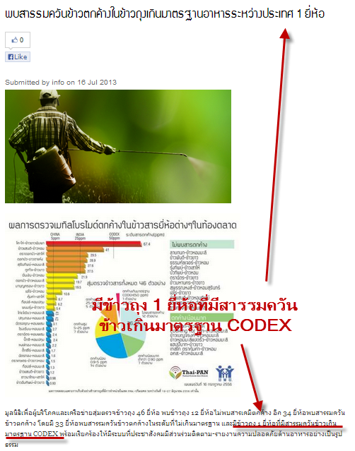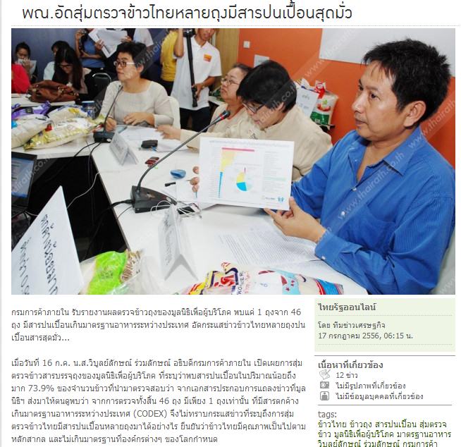 เอามาจากเฟสบุ๊คของ www.facebook.com/fanchaladsue นิตยสารฉลาดซื้อ แถลงข่าว วันที่ 16 กรกฎาคม 2556 มูลนิธิเพื่อผู้บริโภค - มูลนิธิชีววิถี ร่วมแถลง ข้าวถุงร้อยละ 26.1 ไม่พบสารเคมีตกค้าง ส่วนอีกร้อย