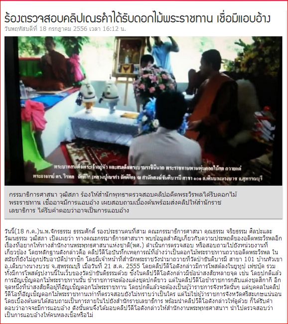 กรรมาธิการศาสนา วุฒิสภา ร้องให้สำนักพุทธฯตรวจสอบคลิปอดีตพระวิรพลได้รับดอกไม้พระราชทาน เชื่ออาจมีการแอบอ้าง เผยสอบถามเบื้องต้นพร้อมส่งคลิปให้สำนักราชเลขาธิการ ได้รับคำตอบว่าอาจเป็นการแอบอ้าง