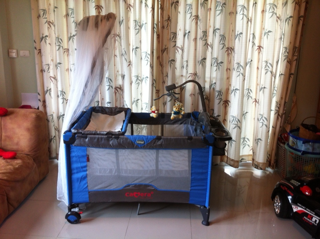 เป็นเปลสองชั้น มีที่เปลี่ยนผ้าอ้อม สามารถปรับที่ขาให้โยกได้ มีเสียงเพลง โมบาย ที่จับหัดเดิน และมุ้งครอบกันยุง