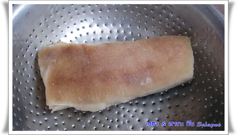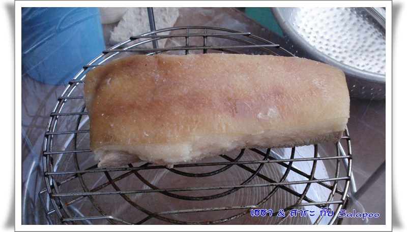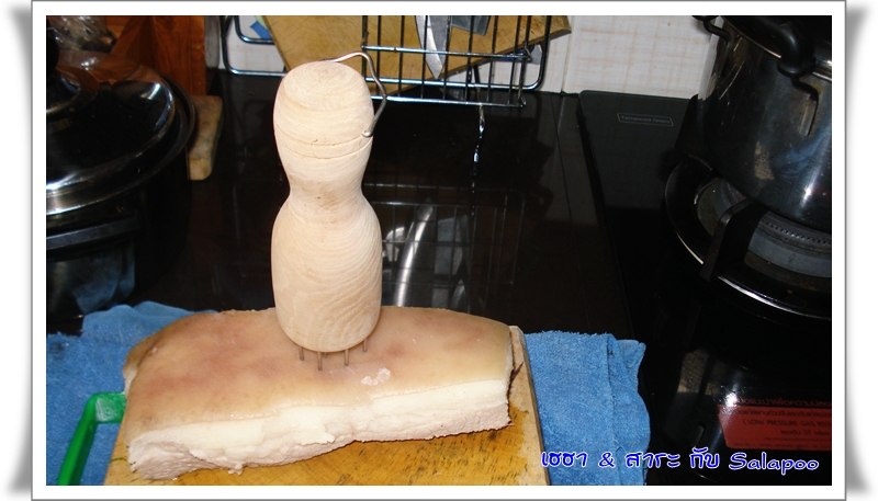 หมูสามชั้น ต้มประมาณ 30 นาที เอาออกมาทิ้งให้เย็น เริ่มปฎิบัติการเครื่องทิ่มหนังหมู