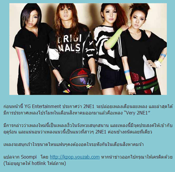 - 2NE1 จะเปิดตัวเพลงทั้งหมด 4 เพลง ตั้งแต่เดือนกรกฎาคมจนถึงเดือนตุลาคม