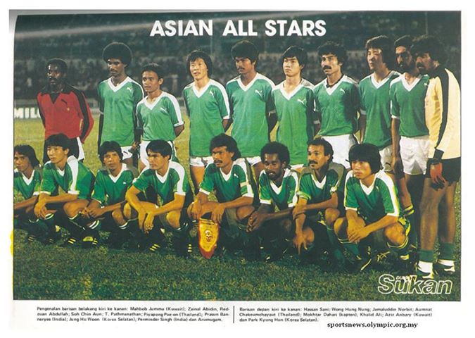 ในภาพมีนักเตะไทยคือเดอะตุ๊กปิยะพงษ์ ผิวอ่อนในวัย 23 ปี (แถวยืน)กับผู้พันกระดูกเหล็กอำนาจ เฉลิมชวลิต (แถวนั่ง) ติดทีมรวมดาราเอเซียแข่งขันที่ประเทศมาเลเซียเมื่อปี ค.ศ.1982