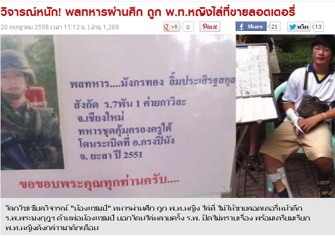 วิจารณ์หนัก! พลทหารผ่านศึก ถูก พ.ท.หญิงไล่ที่ขายลอตเตอรี่