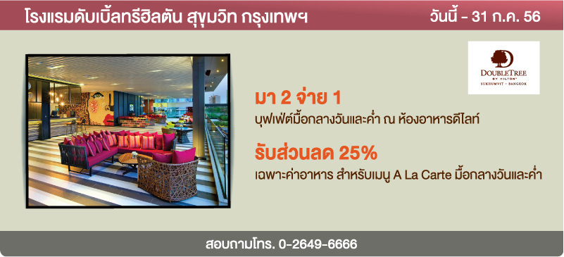 วันนี้ได้มีโอกาสไปลอง บุฟเฟ่ต์มื้อกลางวัน ห้องอาหารดีไลท์ ที่โรงแรมดับเบิ้ลทรีฮิลตัน สุขุมวิท กรุงเทพฯ อยู่ที่ซอยสุขุมวิท 26 ครับ ซึ่งช่วงนี้ (จนถึง 31 กรกฎาคม) มีโปรโมชั่นมา 2 จ่าย 1 ผ่านบัตรเครดิต KTC (รายละเอียดที่ web KTC World