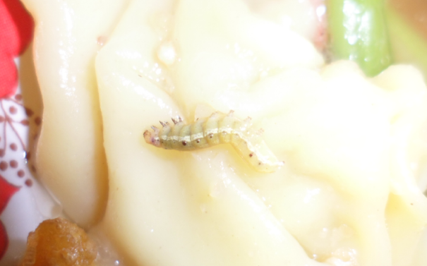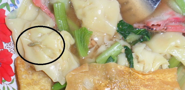 เพิ่งซื้อเกี๊ยวมาเมื่อกี๊ กินไป ๒ ชิ้น แล้วเจอ หนอนตัวนี้เกาะอยู่บนเกี๊ยว แต่ตายแล้ว