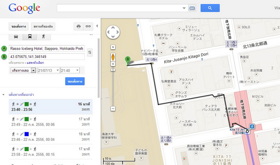 ประมาณ 2.5 km แต่เราก็เลือกนั่งรถไฟเพราะฝนตก ขึ้นรถไฟสาย Nanboku line ลงสถานี Kita 12 Jo แล้วเดินต่อไปอีก 200 เมตร