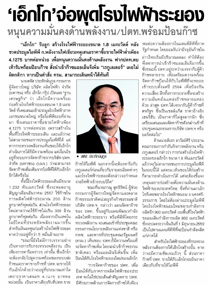 'เอ็กโก'จ่อผุดโรงไฟฟ้าระยอง หนุนความมั่นคงด้านพลังงาน/ปตท.พร้อมป้อนก๊าซ