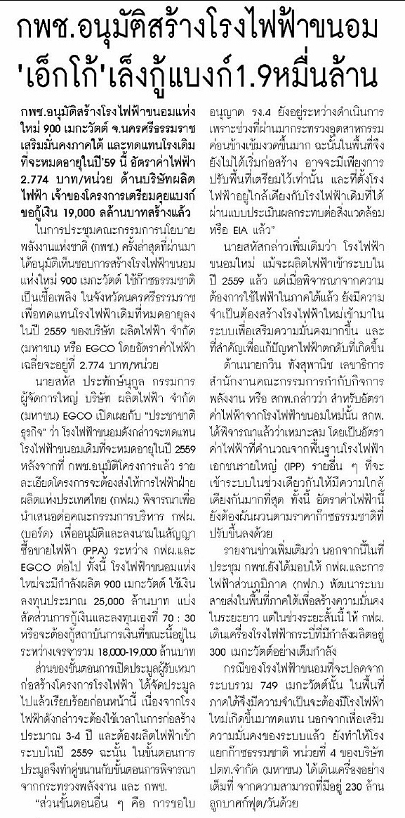 "เอ็กโก"จ่อผุดโรงไฟฟ้าระยอง -- กพช.อนุมัติสร้างโรงไฟฟ้าขนอม จ.นครศรีธรรมราช