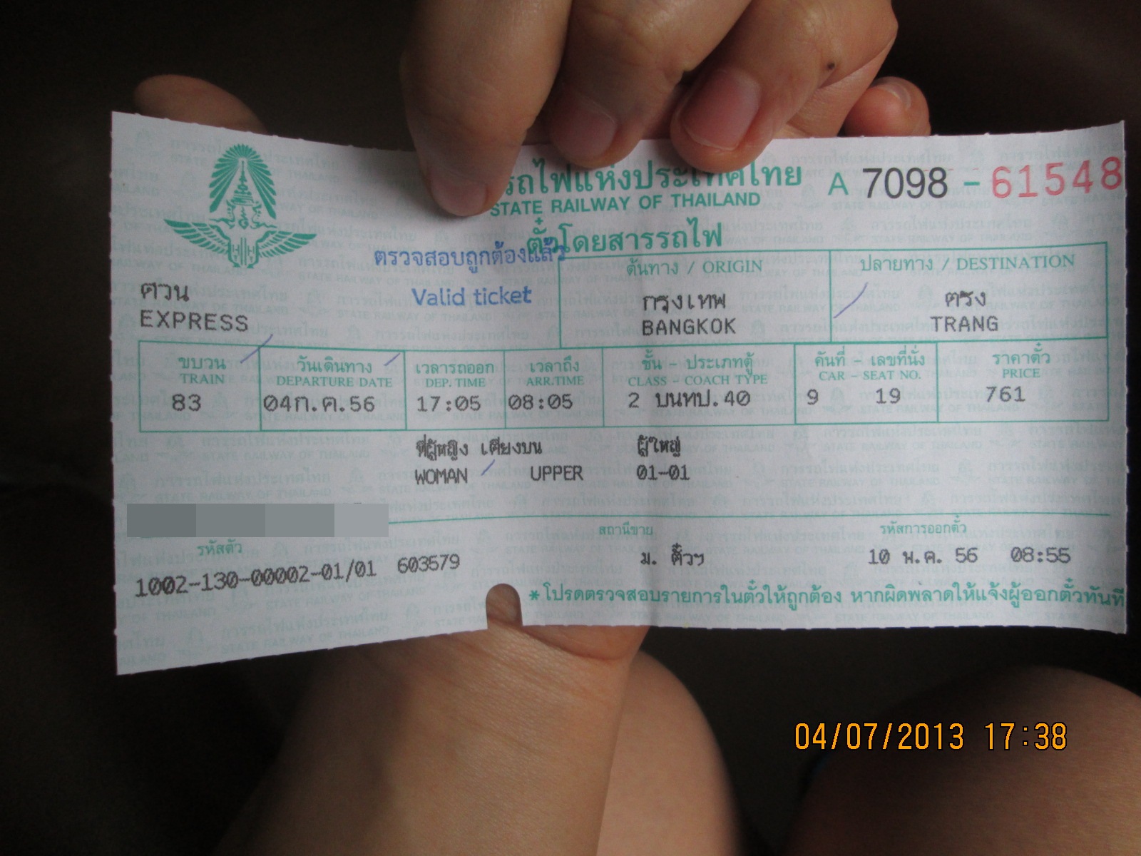 อันนี้คือหน้าตาของตั๋วรถไฟนะคะ เก็บไว้ห้ามหาย เดี๋ยวเขาจะมาตรวจตั๋วเราค่ะ