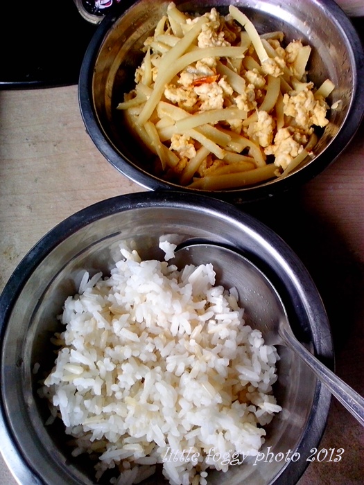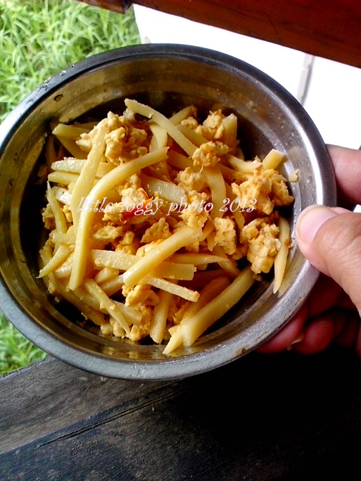 ต้มบ๊วย ผัดเผ็ดหน่อไม้ ไข่เจียวโหระพา หน่อไม้ที่ไปขุดมา เอามาต้มน้ำร้อน แล้วเก็บไว้ในตู้เย็น เอาไว้มาทำกับข้าว อาหารเช้าวันนี้ โหระพา และ กะเพรา เก็บมาจากสวนที่ได้ไปแวะ พริกที่เด็ดมา เอามาตำทำผัดเผ็