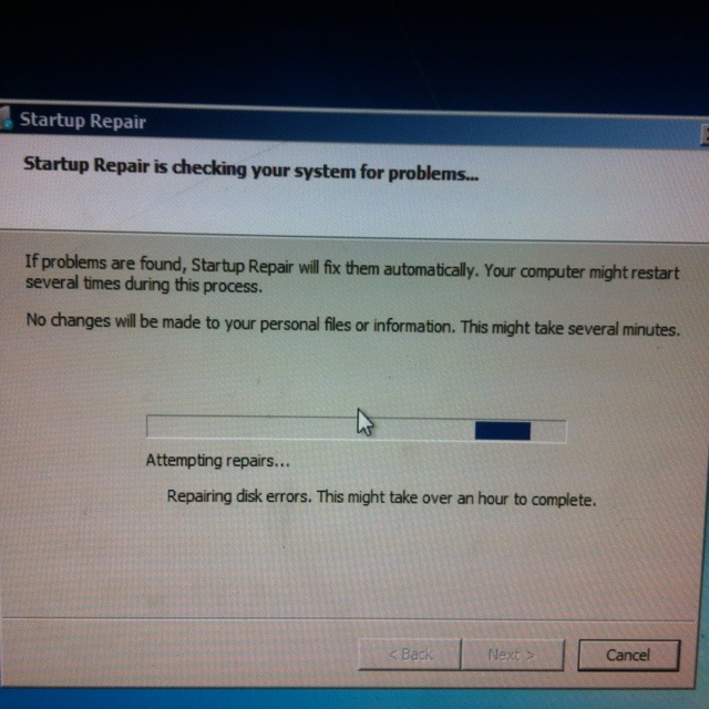เราารีเครื่ิงมหม่แล้วกดเลือกwindow 7 รอบแรกเปิดไปถึงที่มันจะขึ้นโลโก้แล้วพอเสร็จจากหน้านั้นมันก็กลายเป็นจอดำให้เราแต่ยังมีเม้าส์อยู่เราก็รอจนถึงครึ่งชม.มันก็ไม่หายเราเลยรีเครื่องรอบที่2 รอบบนี้เปิดได้เปิดติดแต่งานเราทุกอย่างหายหมดกลายเป็นโปรแกรมขาวที่เปิดไม่ได้เราจะทำไงดีค่ะอยากได้งานคืนมาก