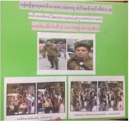 พล.ต.ต.วัลลภ กล่าวต่อว่า ขณะนี้ ตำรวจได้หลักฐานเป็นภาพนิ่งของ 2 คนร้าย จากคลิปวิดีโอที่บันทึกไว้แล้ว โดยจะให้เวลา 3 วันในการเข้ามามอบตัว หากไม่มาตำรวจจะออกหมายจับทันที ในข้อหาทำร้ายร่างกายเจ้าพนักงานขณะปฏิบัติหน้าที่และขัดขวางเจ้าพนักงานขณะปฏิบัติหน้าที่ ส่วนผู้ชุมนุมที่กระทบกระทั่งกับเจ้าหน้าที่เพียงเล็กน้อย จะไม่มีการดำเนินการใดๆ