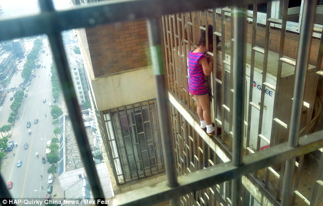 เด็กหญิงถูกปล่อยให้อยู่ในห้องตามลำพัง เธอปีนออกไปจากห้องนั่งเล่น