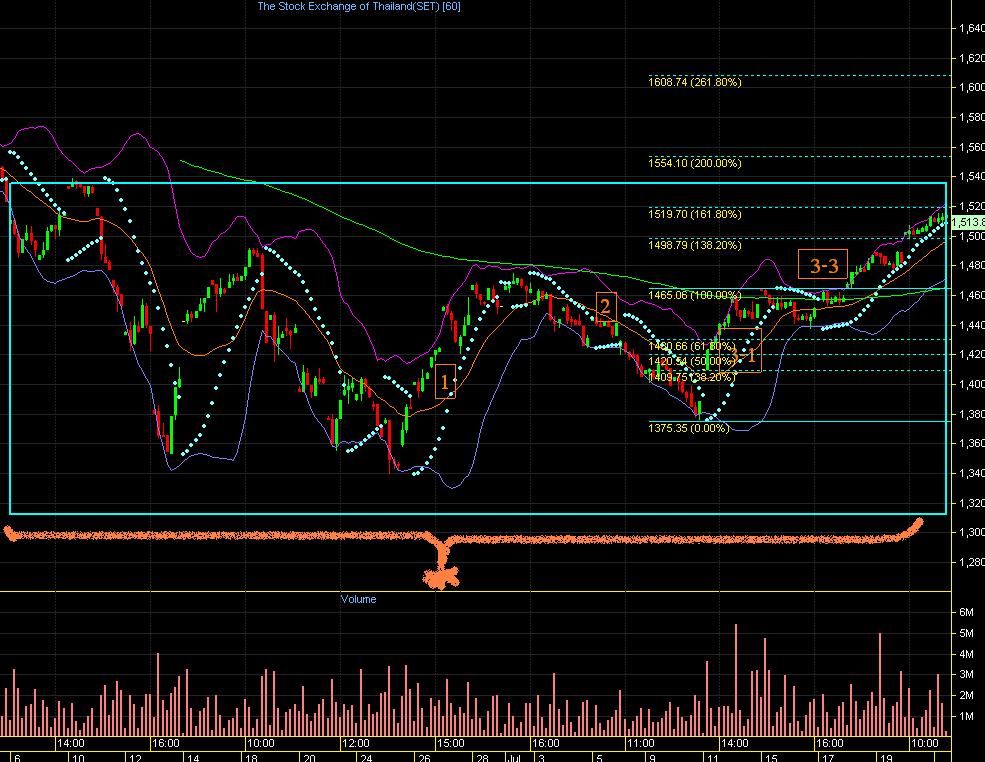 วันนี้ตอบคำถามกระทู้ด้านล่างแยะกว่าทุกวันครับ มาดูภาพรวมก่อนช่วงเช้ามีข่าวดัชนีการจัดซื้อภาคอุตสาหกรรมของจีนลดลง เป็นข่าวที่กดดันตลาดทำให้ภาพรวมของตลาดเอเชียลดลงและ Set ก็เคลื่อนไหวในกรอบแคบๆรอก็เลือกทาง โดยถ้าลองนับคลื่นจิตวิทยาตอนนี้คลื่น B กำลังจะเดินทางไปจบคลื่นย่อย 3-3-5 จะมีย่อคลื่นย่อย 3-4 ทำให้คาดการณ์ว่ามีโอกาสเก็บหุ้นได้ถูกกว่าราคาที่อยู่ในปัจจุบัน ดังนั้นความเห็นส่วนตัวให้อยากให้เหลือเงินสดของการเข้ารอบนี้ไว้รับหุ้นตอนย่อด้วย โดยการย่อครั้งนี้เป้าหมายให้รอจุดจบคลื่นย่อย 3-3-5 ซึ่งคาดว่าจะอยู่ระหว่าง 1515-1520 จุดถ้าเป็นตามนี้แล้วจะได้แนวรับแรกคลื่นย่อย 3-4 ประมาณ 1485-1487 จุดนะครับ แต่ถ้ามีการเปลี่ยนแปลงที่ไม่คาดคิดนอกเหนือจากนี้จะเข้ามาแจ้งในชั่วโมงเทรดอีกครั้ง เพราะเป็นการมองในวิว 60 นาทีลงมาต้องละเอียดมากขึ้นครับ