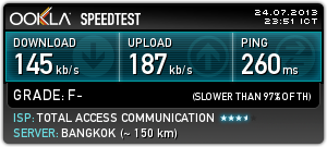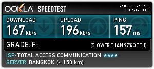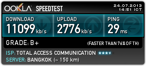 ความเร็วการเชื่อมต่ออินเตอร์เน็ตบนคลื่น 850 และ 2100 แทบไม่ต่างกัน ได้ความเร็วดาวน์โหลด สูงสุดประมาณ 11 - 12Mbps ส่วนอัพโหลด ไม่เกิน 3Mbps Ping โดยเฉลี่ย ประมาณ 30 - 60 ส่วน 2G 1800 ได้ความเร็วดาวน์โหลด และ อัพโหลดประมาณ 150kbps