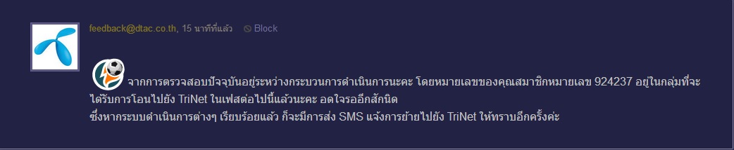 ช่วยตอบคำถามผมทีเถอะ เบอร์ 081-45592xx ของผม ที่เคยแจ้งว่าจะได้ย้ายเข้า Trinet ในเฟสต่อไป คำว่า "เฟสต่อไป" นี่คือเมื่อไหร่ครับ ตอนต้นรอบบิลก็ได้รับข้อความว่า พร้อมย้ายเข้า trinet ให้ไปเปลี่ย