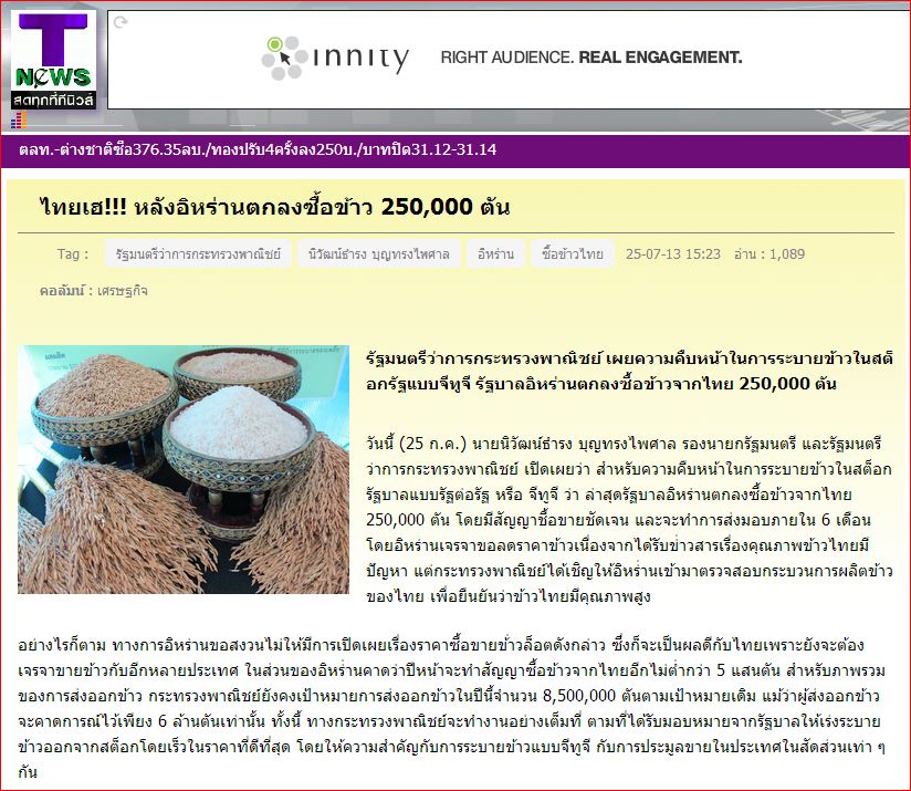 TNEWS ลงข่าว...........ไทยเฮ!!! หลังอิหร่านตกลงซื้อข้าว 250,000 ตัน.........2ประเด็น