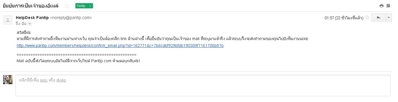 พันทิปมีเมล์มาแจ้งให้กดยืนยัน ผมก็กดตามไป แล้วก็รอ ผ่านไปก็ไม่มีอะไรเกิดขึ้น