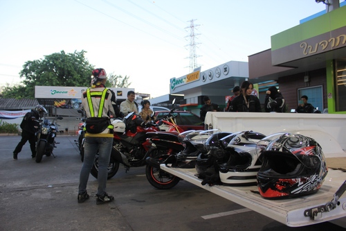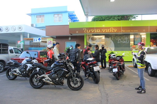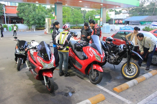 แวะปั๊มบางจากรวมพลกับสมาชิกร่วมเดินทางอีกบางส่วน ทริปนี้มีรถหลากหลายประเภทมากเริ่มต้นด้วย PCX 150 (2 คัน) , CRF ( 2 คัน มีทั้งล้อเรียบและล้อหนาม) , ฟอร์ซ่า 300 (1 คัน) , Z250 (1 คัน) , ER650 (2 คัน)