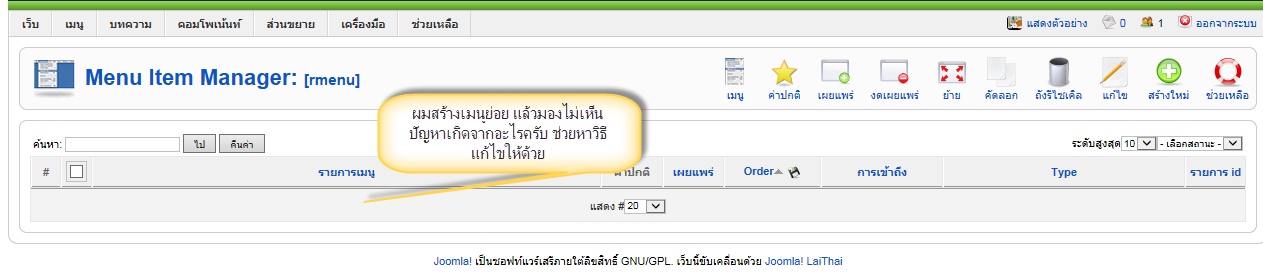 ผมสร้างเว็บไซต์ด้วย joomla แต่มองไม่เห็น เมนูย่อยที่สร้างขึ้น ตามรูปภาพ จะแก้ไขปัญหาอย่างไร