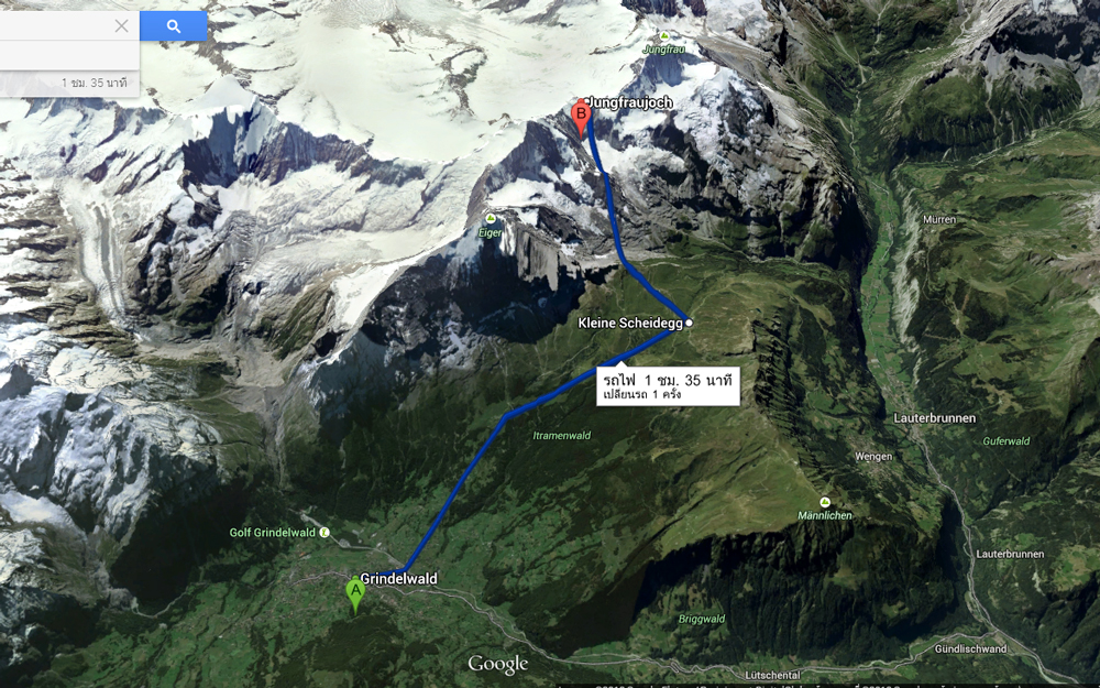 เส้นทางการเดินทางของเราเช้านี้ครับ เราขึ้นรถจาก Grindelwald แล้วลงไปรอรับคนเพิ่มที่ Grindelwald Grund จากนั้นก็ไปเปลี่ยนรถอีกขบวนที่ Kleine Scheidegg จากนั้นก็เข้าอุโมงค์ยาวๆ ไปสุดที่ Jungfraujoch ครับ เวลาเดินทางประมาณเที่ยวละ 1 ชั่วโมง 45 นาที
