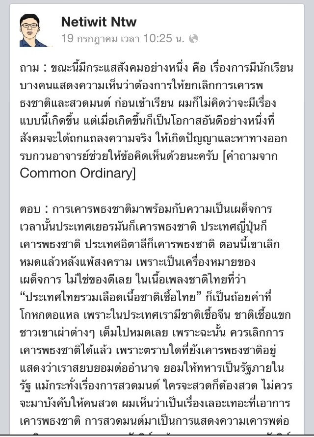 วันนี้ 23 ก.ค. 56 ผู้สื่อข่าวรายงานว่า นายเนติวิทย์ โชติไพศาล ชื่อเล่น แฟรงก์ นักเรียนชั้นมัธยมศึกษาปีที่ 4 โรงเรียนนวมินทราชินูทิศ เตรียมอุดมศึกษาพัฒนาการ ได้โพสต์ข้อความผ่านเฟสบุ๊ค username ว่า Neti