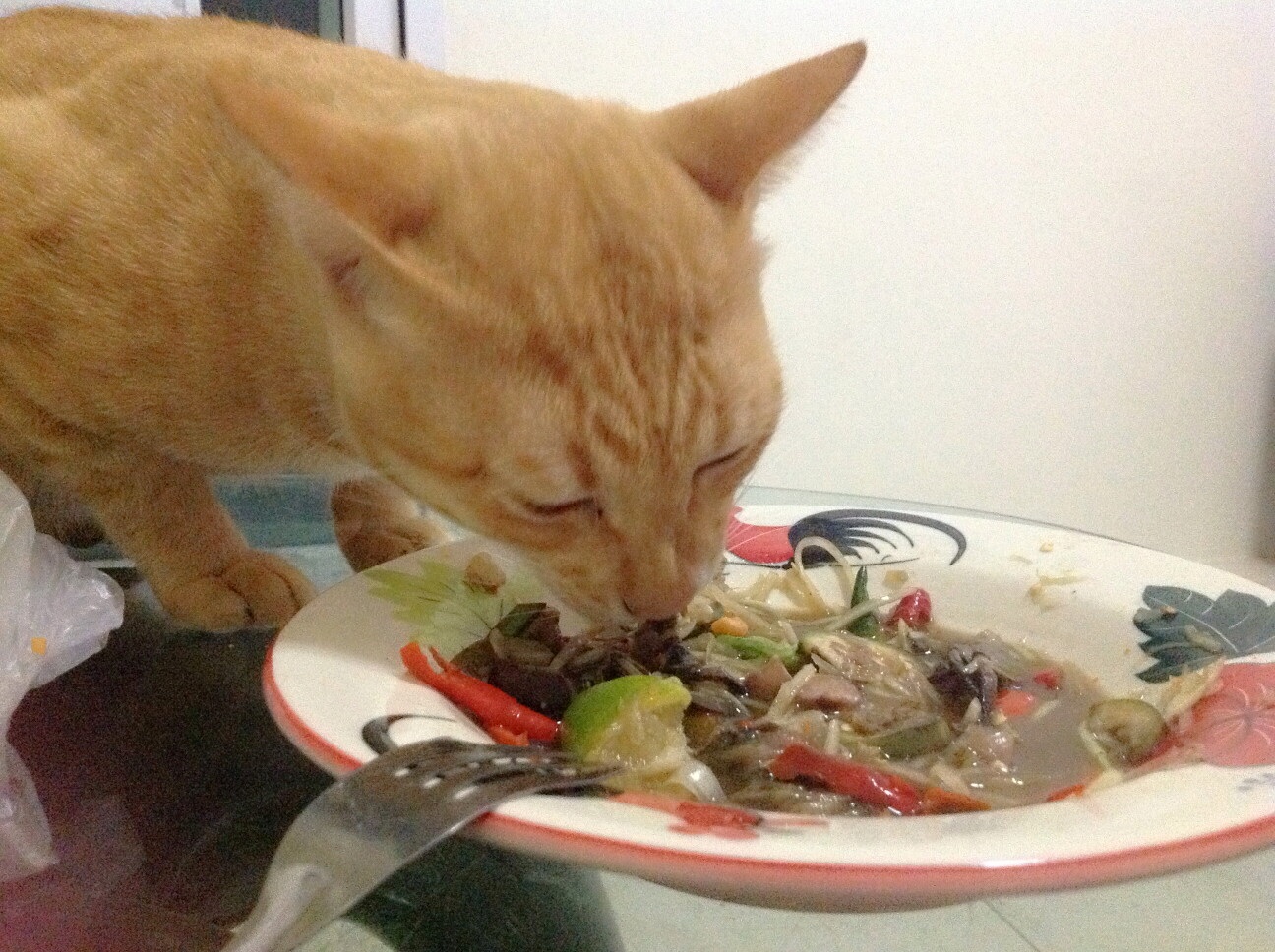 นี่ค่ะ เจ้าทิกเกอร์นี่ค่ะ แอบขโมยส้มตำปูปลาร้าของคุณสามีมุก ตอนที่เค้าเดินไปหยิบน้ำมากินแก้เผ็ดน่ะค่ะ