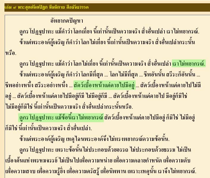 (๑) "เธอทั้งหลายจงอย่าคิดเรื่อง "โลก" ว่า โลกเที่ยง โลกไม่เที่ยง ฯลฯ สัตว์ตายแล้วเกิดอีก ฯลฯ"