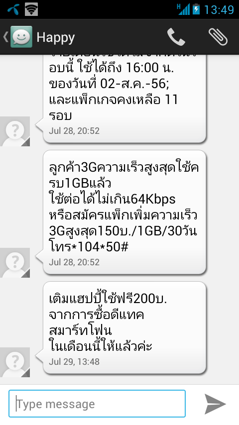 วันนี้ 14 สิงหาคม 2556 เวลา 10.00 น. ได้รับข้อความจาก sender name " Happy" ข้อความระบุว่า " ลูกค้าแฮปปี้รักษาสิทธิ์ในการเป็นเจ้าของหมายเลขนี้ กรุณาลงทะเบียนแสดงความเป็นเจ้าของโดยกด *1