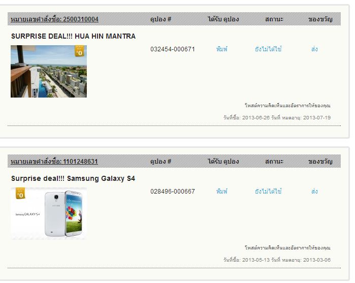 คือว่าเวลามีดีลโปรโมชั่น 0 บาท ก็มีคนซื้อกันเยอะๆ พอเรากดซื้อ เค้าก็ส่งเลขที่ทำรายการซื้อมา เราก็ไม่ต้องชำระเงิน แต่คือตัวเองก็ไม่รู้ว่า ถ้าจะได้ตามดีลที่เค้าตั้งไว้ต้องทำอย่างไรหรอ ต้องส่งไปไหนหรือเปล่า คือ งง จริงๆ ไม่เคยใช้เลย เพราะใช้ไม่เป็น