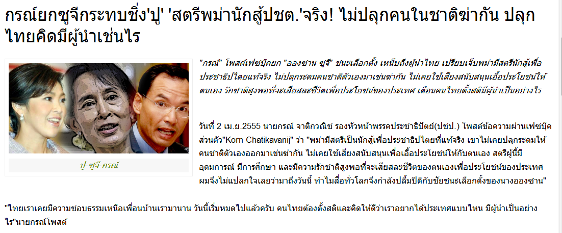 ราคาผลไม้ภาคเหนือของท่านที่ตกตํ่าจนส.ส.ประชาธิปัตย์ต้องออกมาเรียกร้องให้ท่านไปช่วย ท่านรอเรื่องอะไรอยู่ครับ ถึงจะสนใจ ?! ปกติผมไม่เคยออกมาว่าอะไรท่าน แต่ตอนนี้ผมข้องใจจริงๆ และเสียดายแทนกับโอกาสที่ท่านมี” นายกรณ์ ระบุผ่านเฟซบุ๊กส่วนตัว.