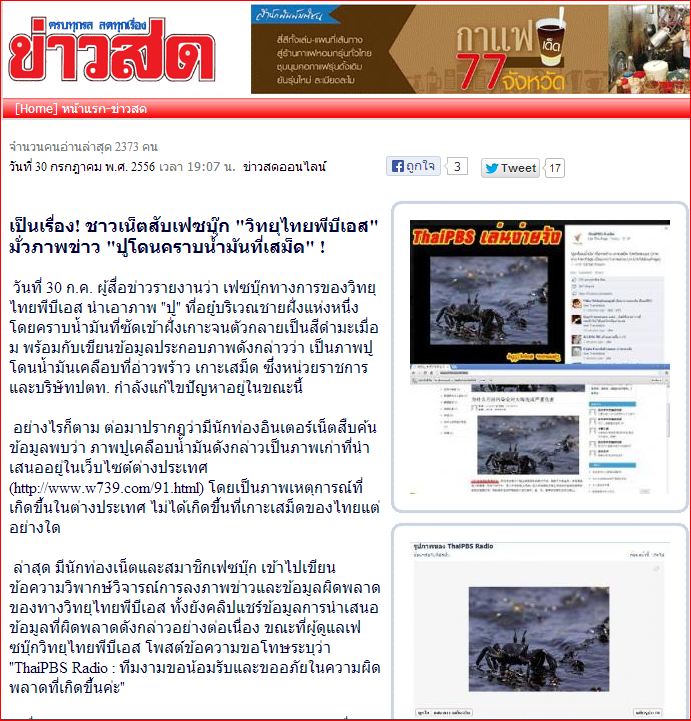 เป็นเรื่อง! ชาวเน็ตสับเฟซบุ๊ก "วิทยุไทยพีบีเอส" มั่วภาพข่าว "ปูโดนคราบน้่ำมันที่เสม็ด" !